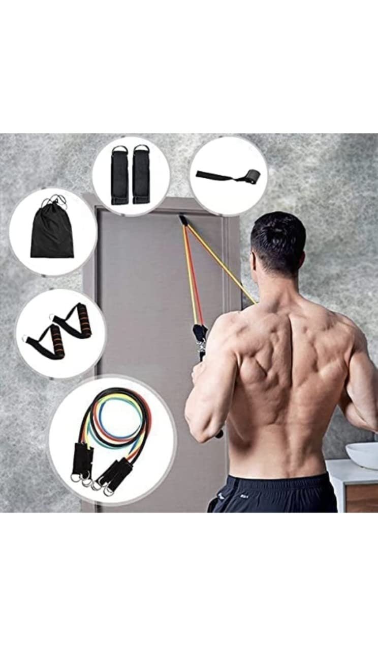 Five Levels 11pcs Resistance bands : Adjustable Resistance Bands, Maximum equivalent of 150 lbs – Comes as a set of 5, 48-inch long colored exercise bands: Yellow (10 lbs),Blue (20 lbs), Green (30 lbs), Black (40 lbs), Red(50 lbs). All bands can be combined together to provide up to 150 lbs